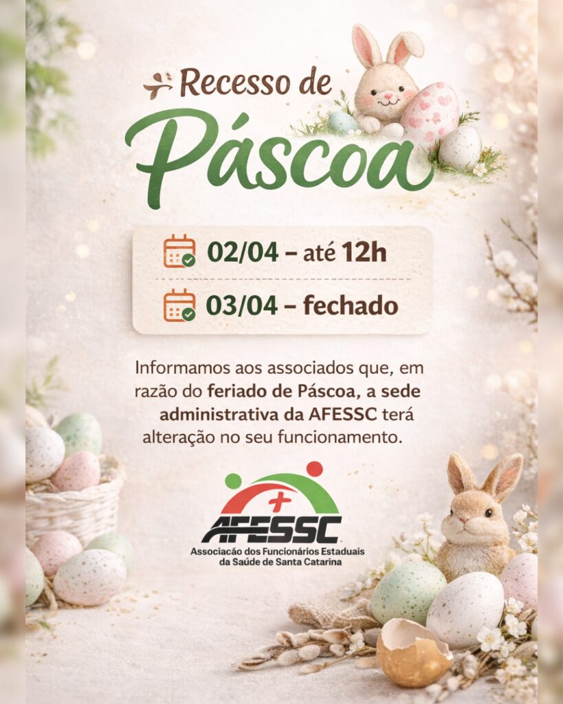 A AFESSC informa aos seus associados que, em virtude do feriado de Páscoa, a Sede Administrativa terá alteração no horário de atendimento.